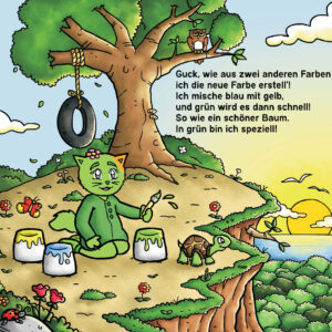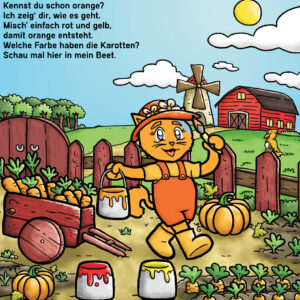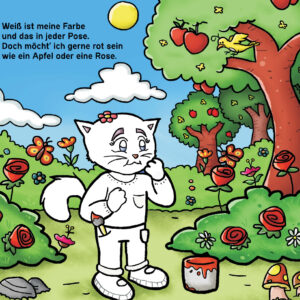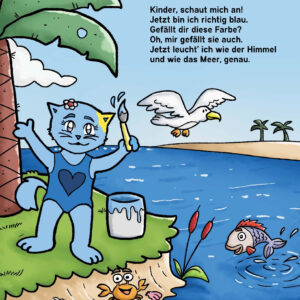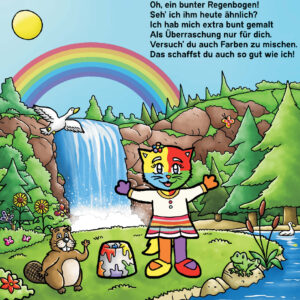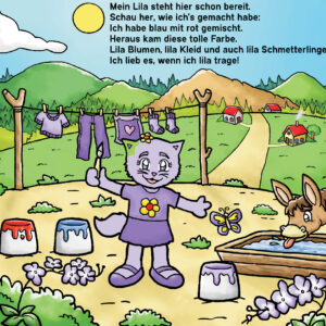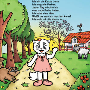 Dieses Buch erklärt Kindern die Grund- und Mischfarben (weiß, rot, gelb, blau, orange, grün, lila, Regenbogen-Farben) in einer kurzen Geschichte, durch die die „Katze Luna“ führt. Auf 11 Blättern können Kinder dann versuchen mit eigenen Mitteln (Stift, Pinsel, u.ä.) die Motive der gegenüberliegenden Seite aus der Geschichte nachzumalen.