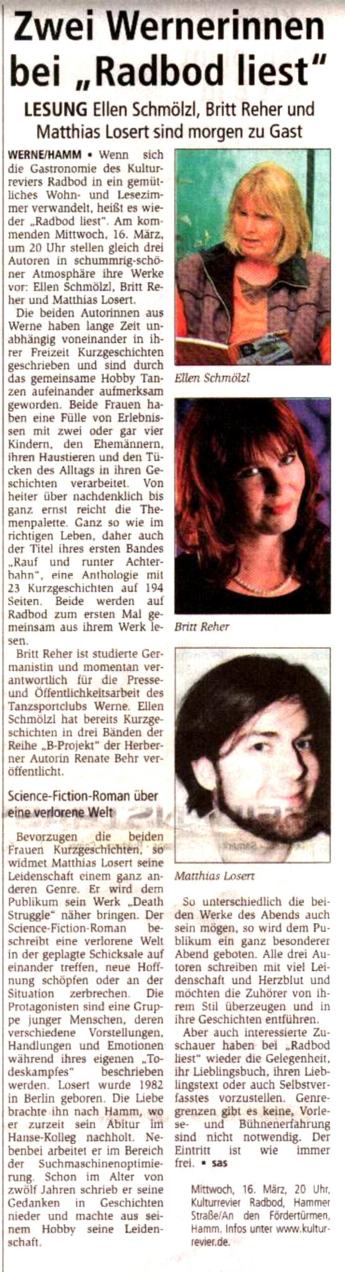 15.03.2011, Westfälischer Anzeiger – Hamm, Lesung aus „Rauf und runter Achterbahn“, Ellen Schmölzl/Britt Reher